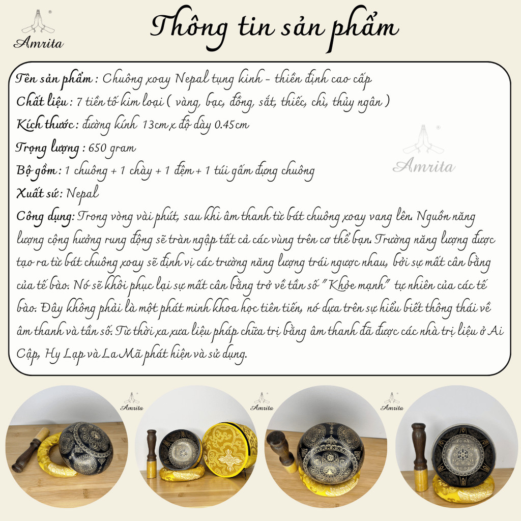 Traditional singing bowl therapy is based on the connection between the molecules in the body and the vibrations and sound waves of the Himalayan singing bowl. This connection will bring people back to a state of balance, feel peace of mind, bring positive therapeutic effects and maximum efficiency.